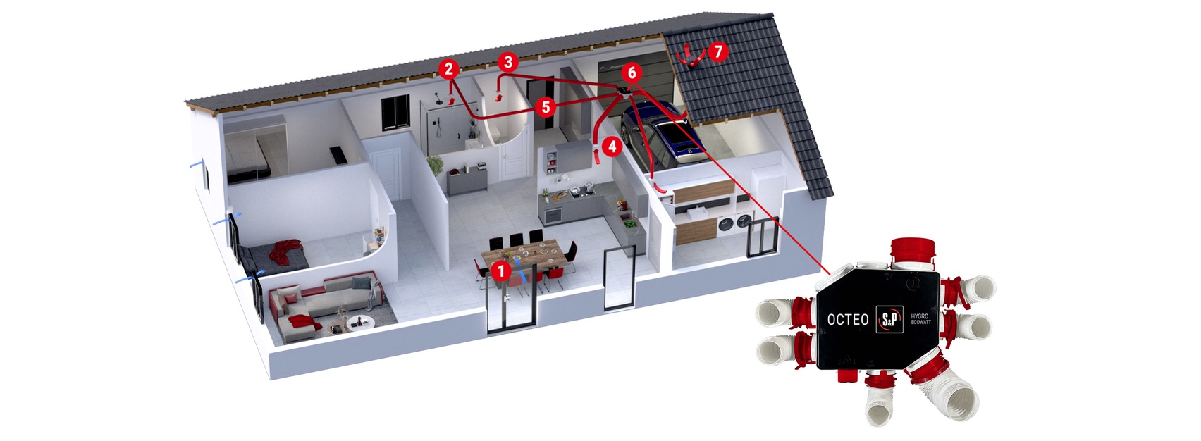 - Habitat individuel : VMP/Aérateurs, VMC Simple-flux, VMC Double-flux, traitement de l'humidité, systèmes de purification, chauffage d'appoint, entrées d'air, bouches, accessoires électriques, conduits et accessoires plastiques.